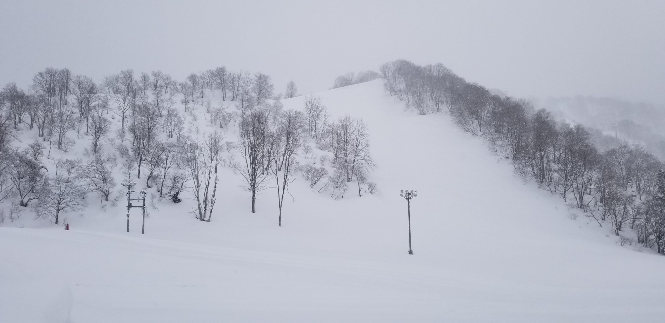 今シーズン初のツリーランをしてきました。 チャレンジコースの上から見るとスキーセンターは真下です。 コロナ前はここを松明滑降をしていましたね。 普通なら恐ろしい斜面ですがパウダーが30cm~50cm積もると快適な斜面になります。